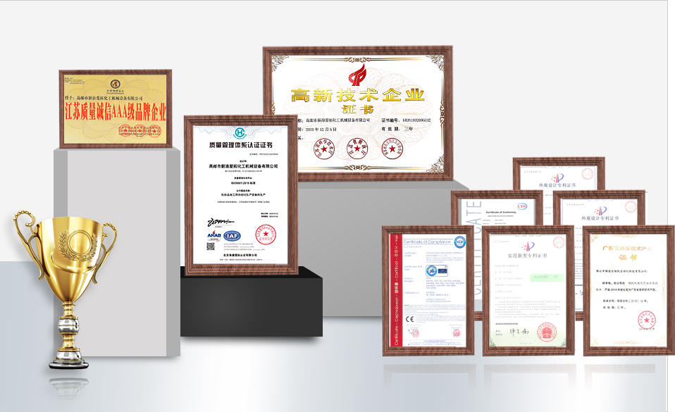 榮獲30余項(xiàng)實(shí)用新型和外觀(guān)專(zhuān)利證書(shū),乳化機(jī)/灌裝機(jī)等多款產(chǎn)品被認(rèn)定為高新技術(shù)產(chǎn)品